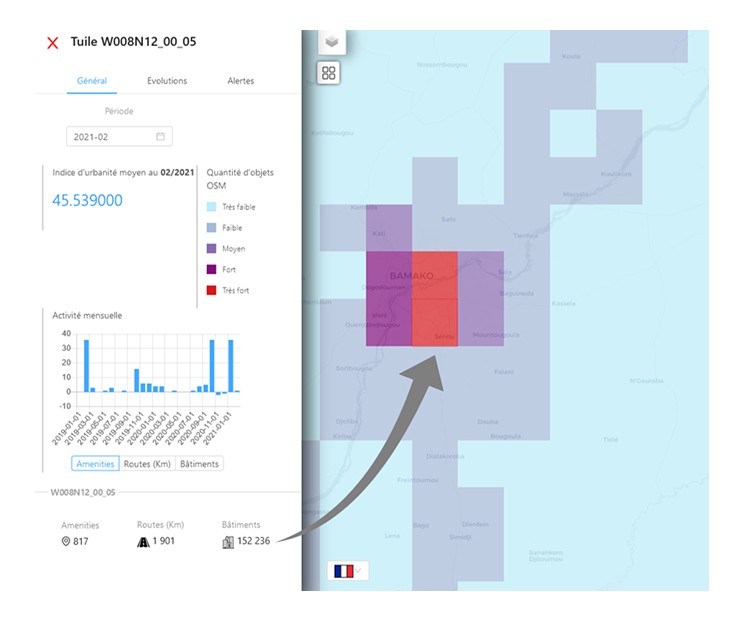 Un indice permet à l’utilisateur de connaître la richesse globale de la base OSM et de chaque maille (10x10km en freemium, 1x1 en premium), et de détailler certains contenus spécifiques (bâtiments, routes, point d’intérêt - amenities).
