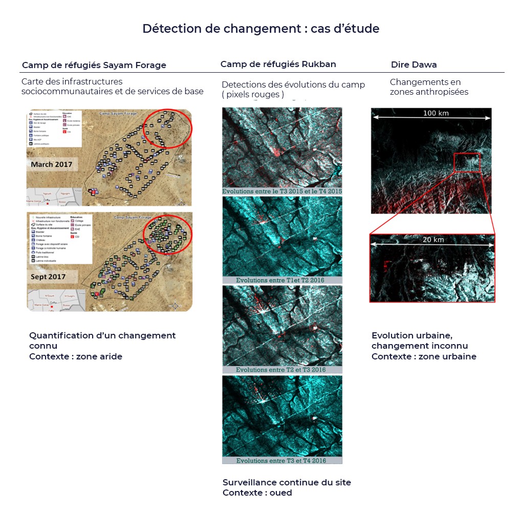 L’étude commanditée par le SatCen couvre l’ensemble du processus permettant d’offrir un service de détection de changement : état de l’art/analyse des algorithmes/outils et services de détection de changement, des plateformes de stockage et de la distribution des données Sentinel-1.